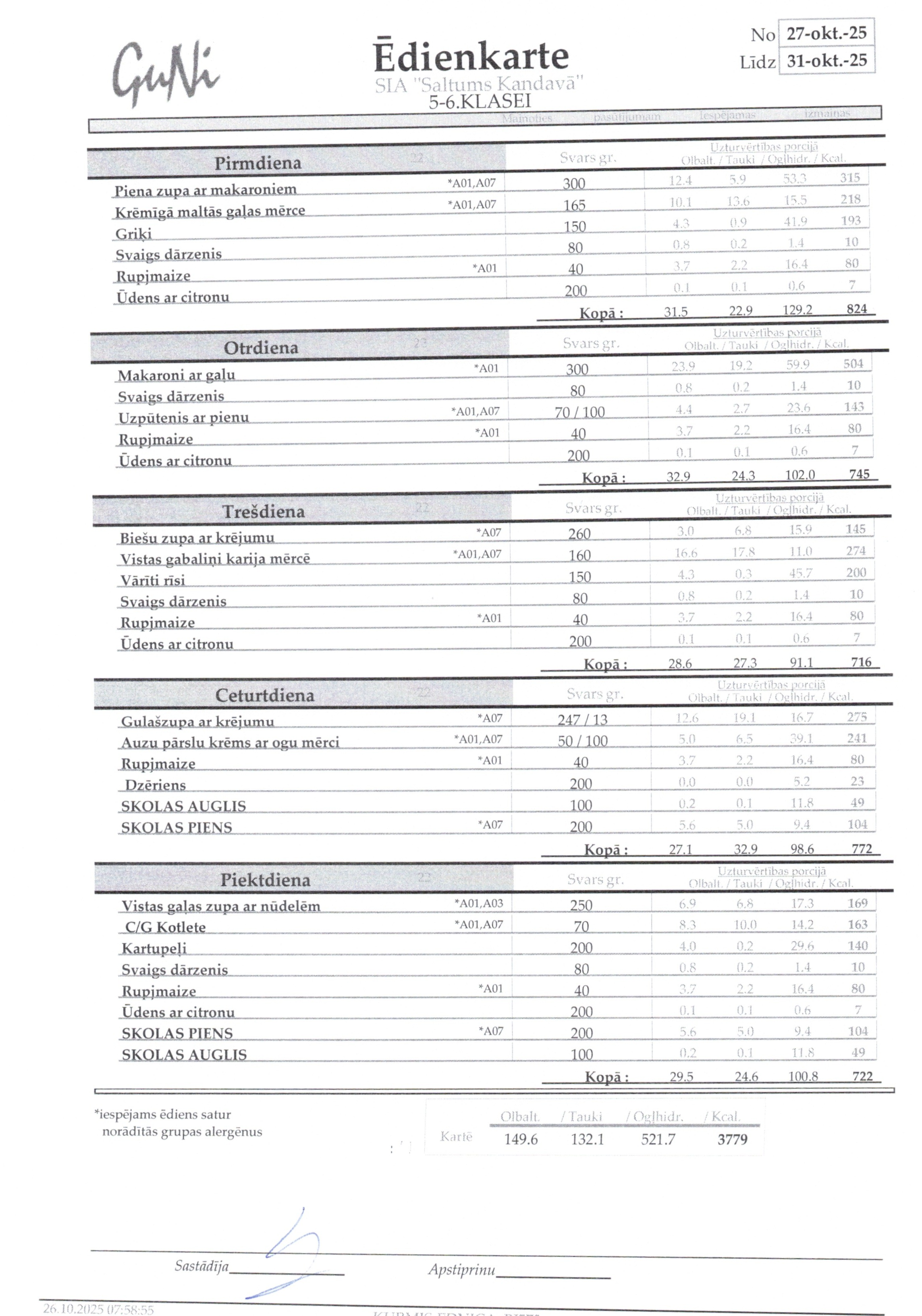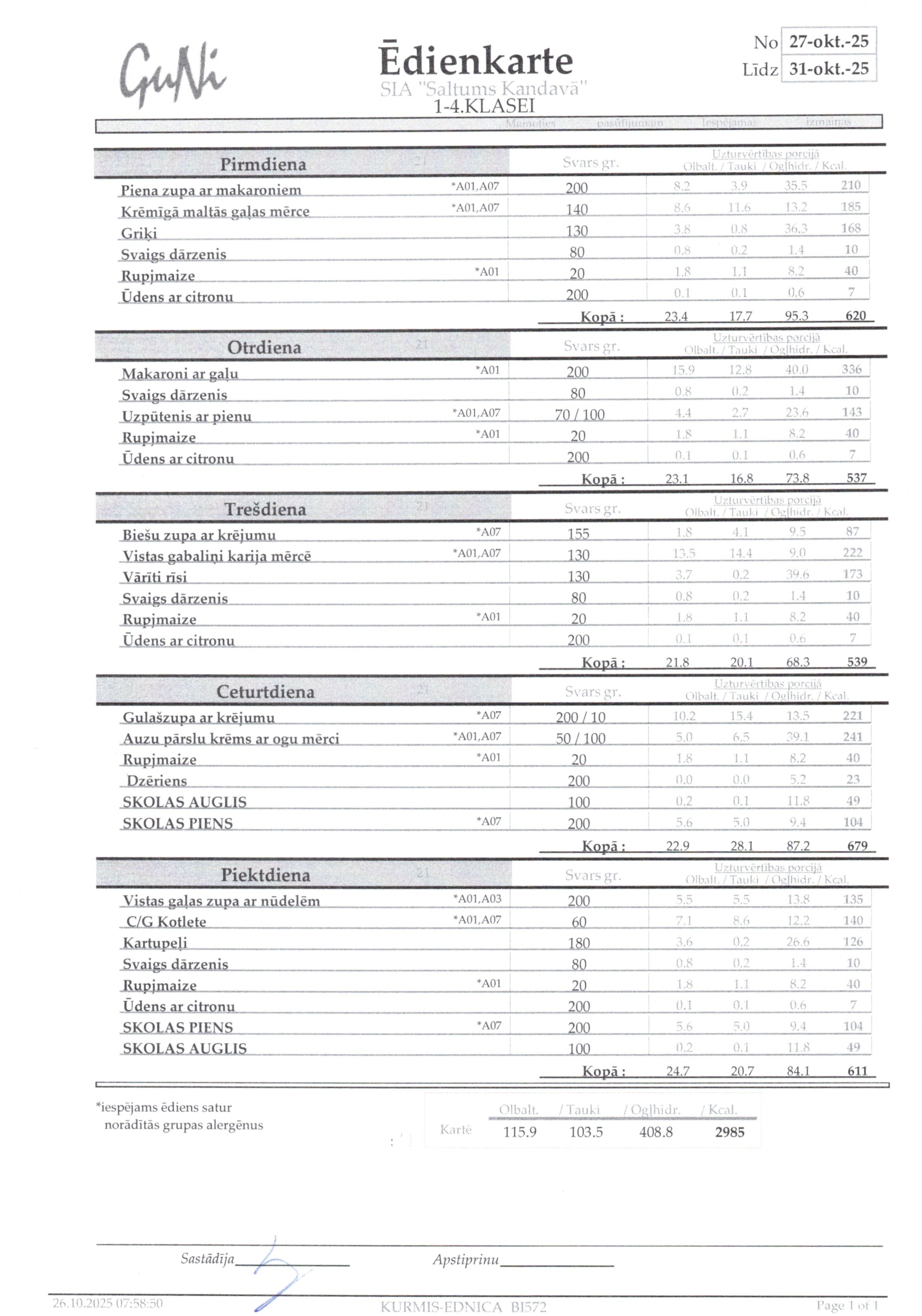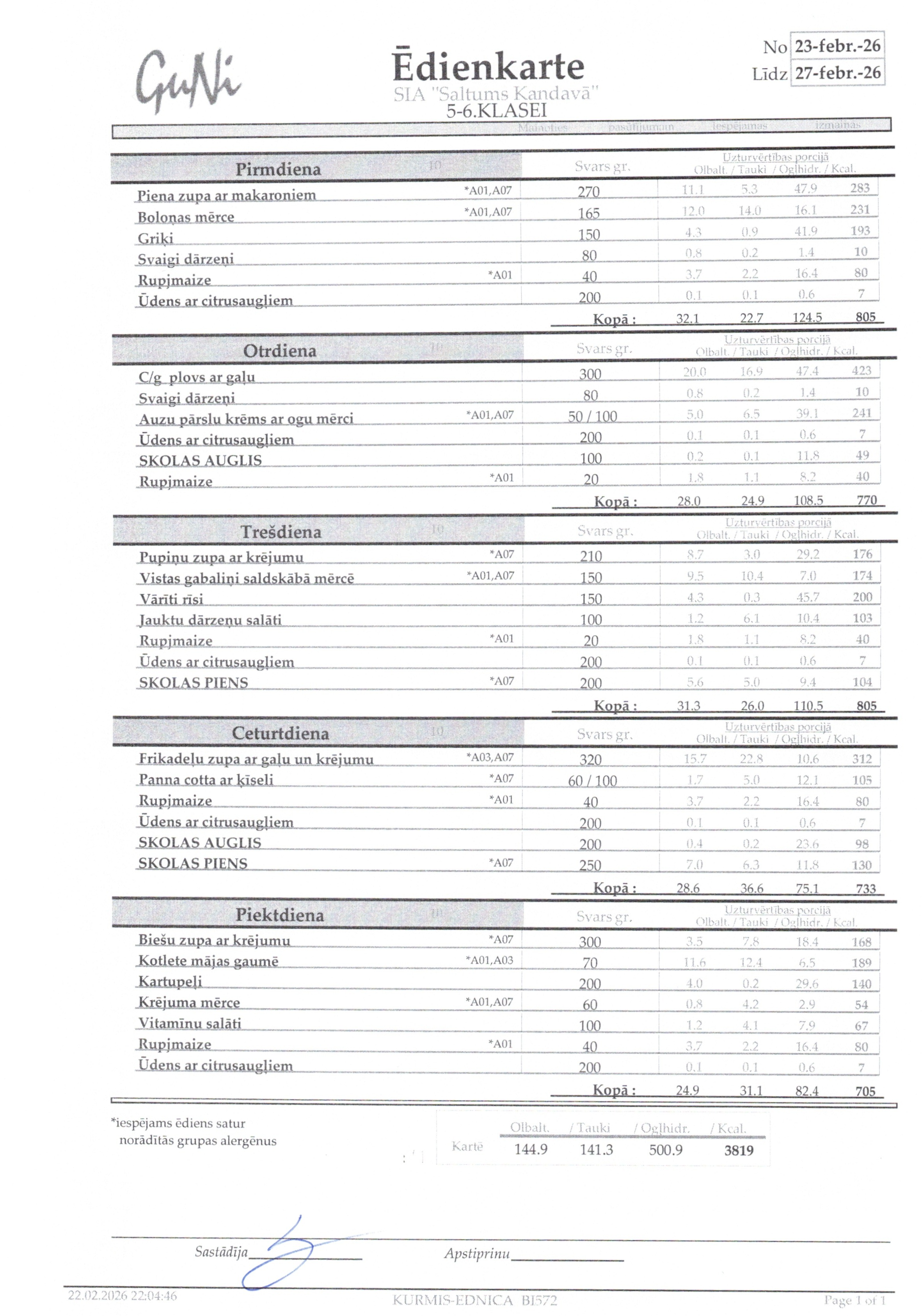Jelgavs 4. sākumskolas ēdienkarte: |